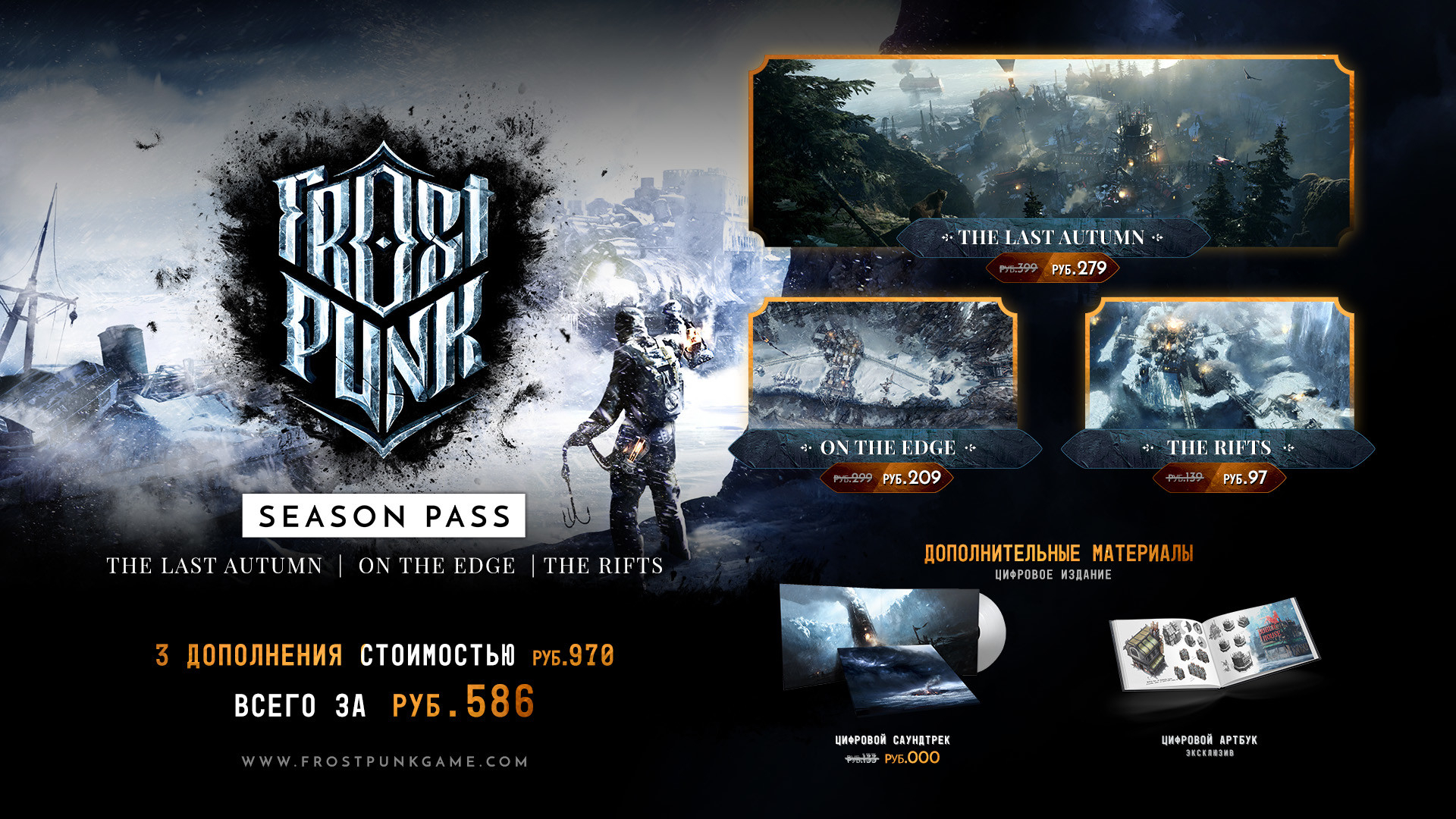 Официальный сезонный абонемент для Frostpunk полностью доступен и завершен! Он откроет вам доступ ко всему дополнительному контенту, который игра получила после релиза, в том числе к трем расширениям (The Last Autumn («Последняя осень»), On The Edge («На краю») и The Rifts («Ущелья»)), обогащающим основной сюжет и заполняющим пробелы в истории игровой вселенной. А завершив игру, вы сможете расслабиться, прослушав цифровой саундтрек, в состав которого входит оркестровая музыка, или же узнать о мире игры больше, просмотрев эксклюзивный цифровой артбук.