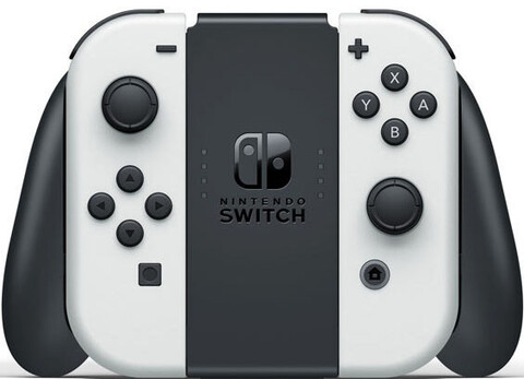Консоль Nintendo Switch (OLED-модель) доступна в белом цвете с белыми контроллерами Joy-Con, черным основным блоком и белой док-станцией.