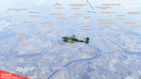 • 8 самолётов битвы за Москву: четыре истребителя (И-16 тип 24, МиГ-3 24-й серии, "Мессершмитты" Bf 109 E-7 и Bf 109 F-2), штурмовик Ил-2 1941 года, тяжёлый истребитель-бомбардировщик Bf 110 E-2, бомбардировщики Пе-2 35-ой серии и "Юнкерс" Ju-88 A-4.