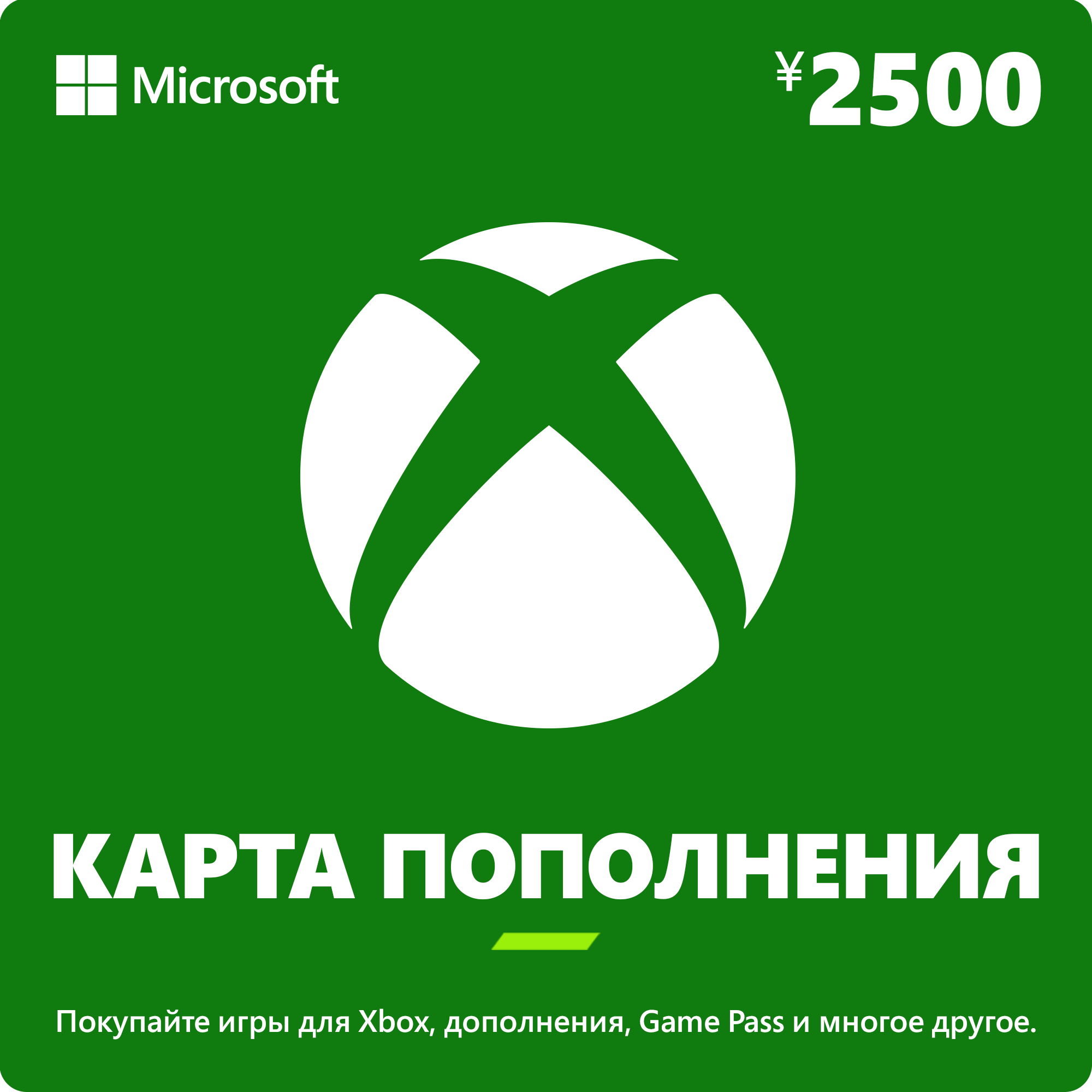 Карта оплаты Xbox 2500 JPY позволяет пополнить баланс виртуального бумажника Microsoft Store на 2500 японских иен. Подарочные карты Xbox - это отличный способ пополнять баланс своего кошелька в сервисе Xbox (Microsoft Store).